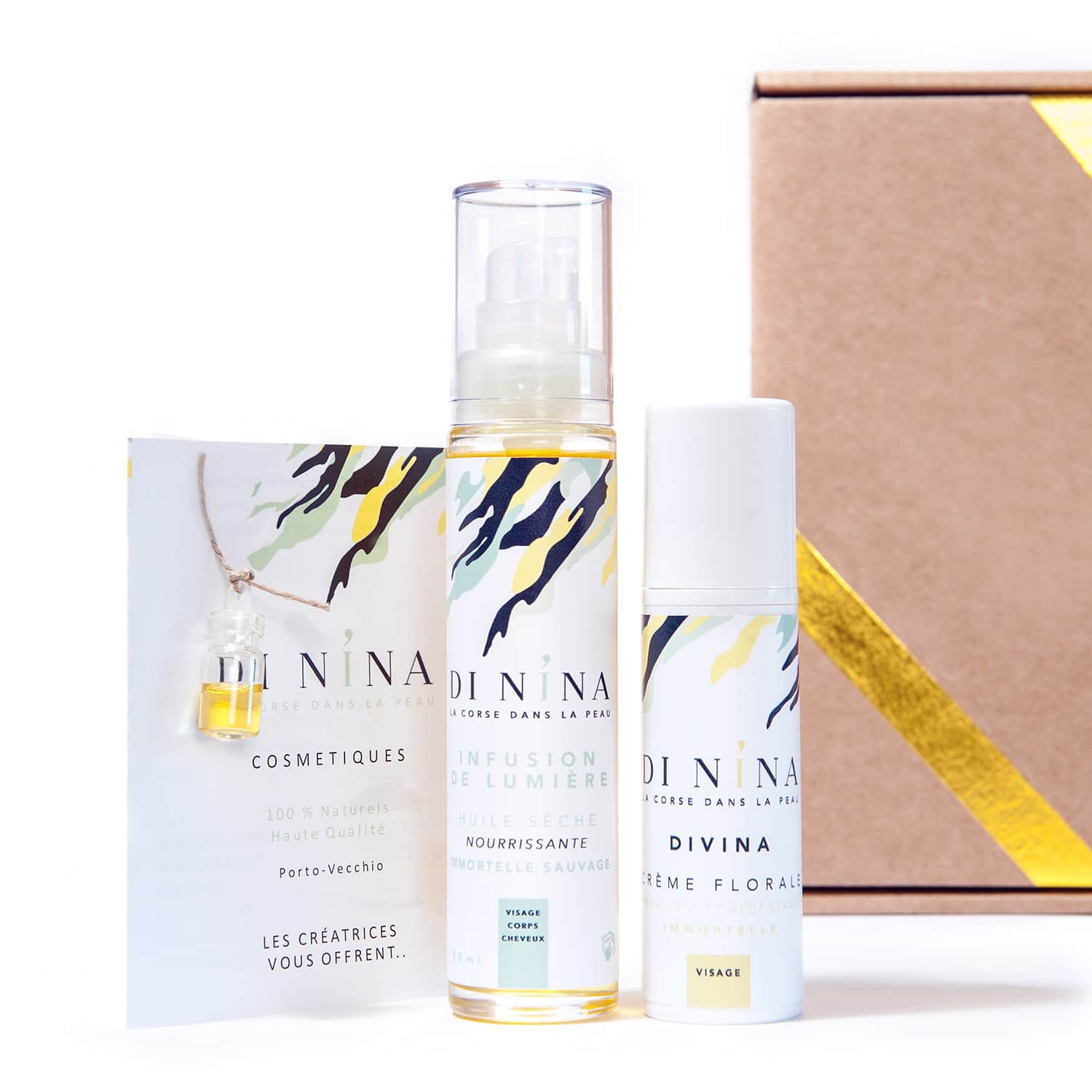 Découverte de l’immortelle pour le Visage et le Corps, Ce coffret contient les essentiels DI NINA avec tous les bienfaits de l’immortelle de Corse.